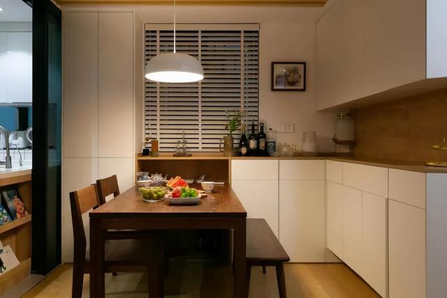 餐厅橱柜的设计方案非常合适,两边紧贴墙壁并定制,中间是餐桌的开放空间,储物能力特别强。右边的餐厅柜从上到下分为三部分,下部作为鞋架,底部悬空。中间可以作为迷你吧,当然连接左边;顶部是一个壁橱,用来存放和整理房间的内部器官。