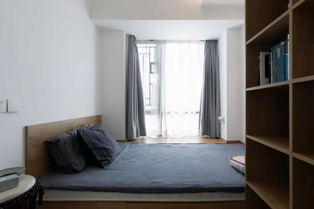 客人已经干了榻榻米的设计方案,加上了浮动窗台,从而完成了床、衣柜、书柜的功能。乳白色衣柜靠近卧室通道,依然是端庄的设计方案,最大限度的提高了空间利用率。