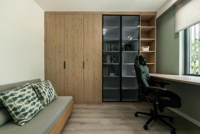 书房的配色以鲜豆绿为主,营造出舒适轻松的氛围。对于书房的主人来说,它不仅是办公书房的空间,也是接待区。通常,朋友来家里做客,可以在这里喝茶聊天。书柜由两部分组成,一侧有一扇实心木门,用于存放书籍;另一边有一扇玻璃门,可以放一些手工制作和装饰品。