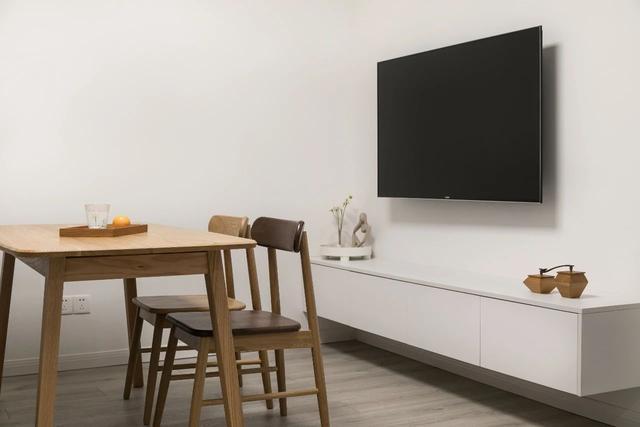 电视柜选择了“一字型”悬挂设计,简洁大气。白色橱柜与房间主色调一致,整体感更强。