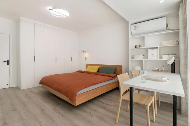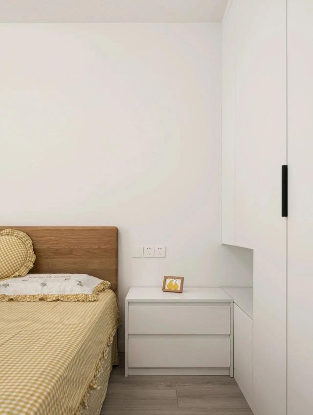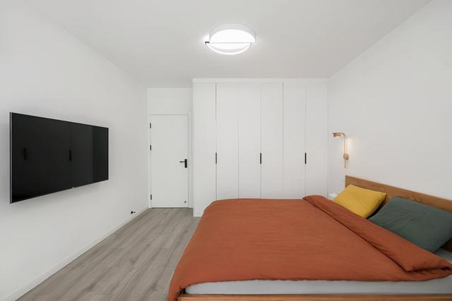 在床的另一边,你可以看到一个整面墙的衣柜。白色橱柜保证了空间的连续性和业主的日常收纳需求。卧室里电视机的设计也很用心。设计师把电线和插座藏在电视机后面,外观更整洁。