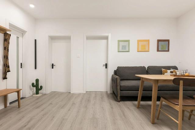 客餐厅的沙发、桌子、椅子全部靠墙摆放,房间内留出一半的白色空间,看起来非常宽敞。如果业主以后需要,这个区域也可以重新规划。