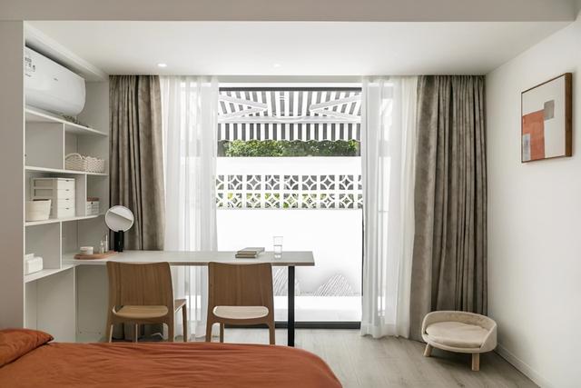 考虑到两位屋主平时都有在家办公的需求,设计师借用了部分院子空间,在主卧增加了一个办公区。纯白色长桌的设计可以两个人同时使用。