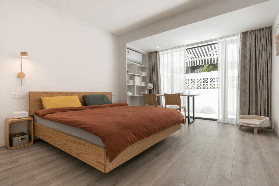 改造后,卧室不仅变得更加宽敞,而且采光率也有所提高。大落地窗将屋外的光线和景色引入卧室,下午坐在卧室喝茶看书,非常惬意!