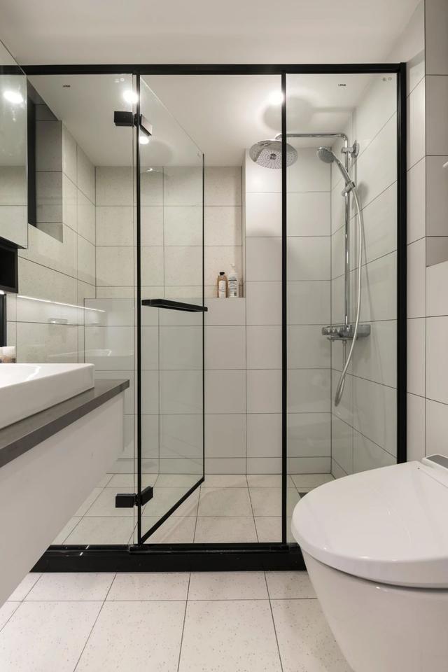 改造后,卫生间的面积增加了很多,还可以做干湿分区。设计师用玻璃隔断将淋浴区和盥洗台、卫生间隔开,这样会更方便打理。