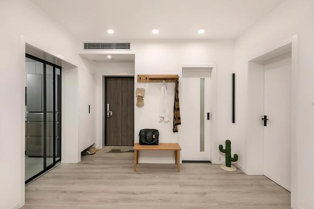 玄关作为整个房子的“第一印象”,在家居装修设计中起着至关重要的作用。在这种情况下,玄关的设计简单而实用,有嵌入式鞋柜、换鞋凳、挂衣区和镜子。而且每一项都不会占用太多空间,有效减少拥挤感。