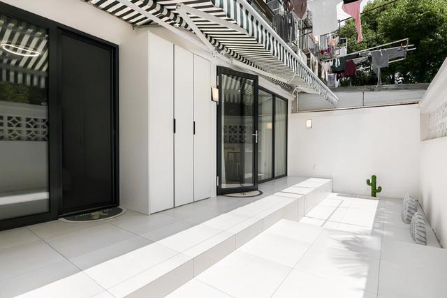 拆除主卧和院子之间的隔墙,将20㎡的院子分出一部分纳入到卧室做成工作区,并且使用玻璃推拉门,让整体更加通透宽敞。