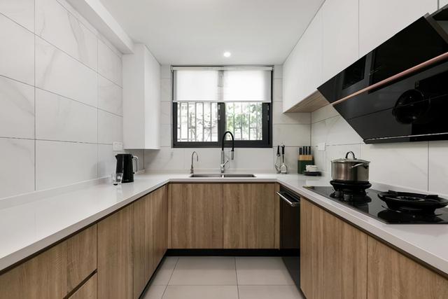 厨房采用U型格局,使用空间非常宽敞,四个人同时做饭不会觉得拥挤。为了提升储物空间,设计师在U型柜的基础上增加了一排白色吊柜,可以存放更多的杂物。