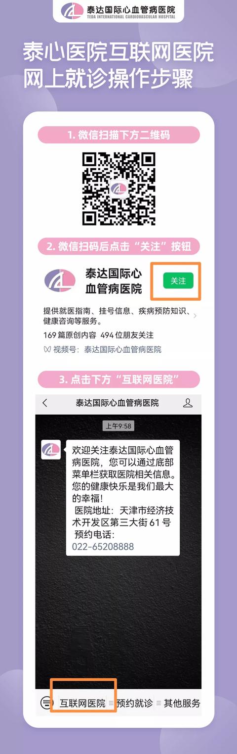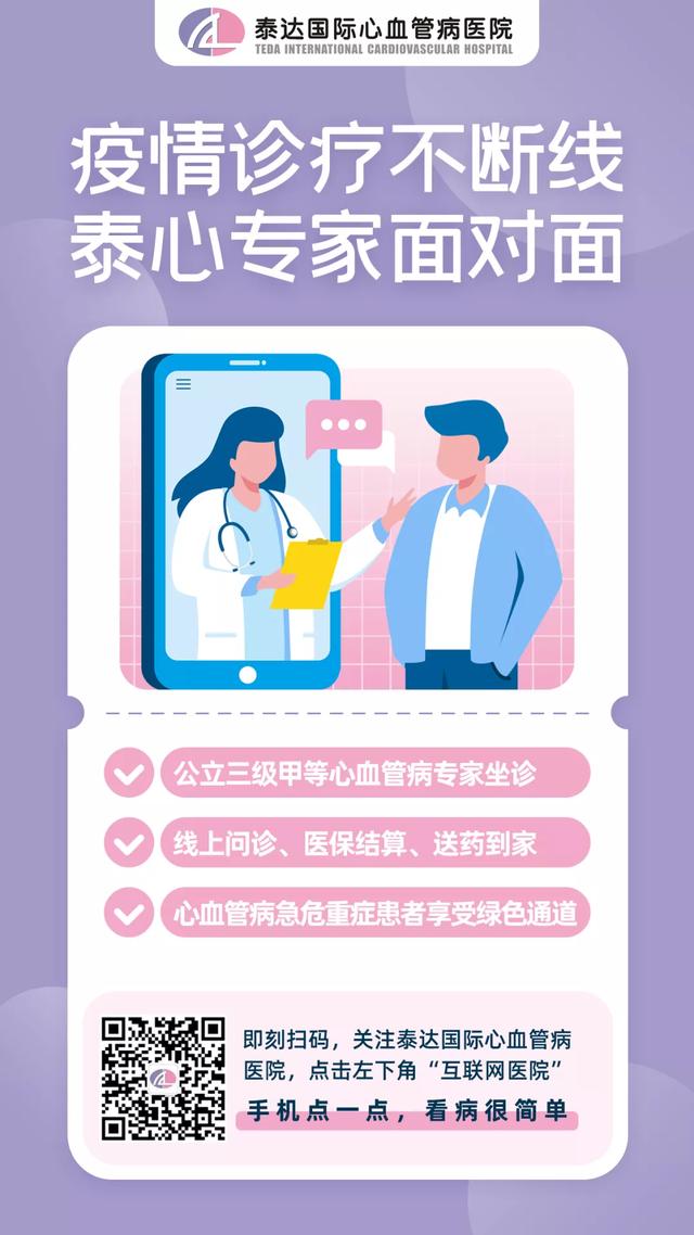 疫情当前,泰心互联网医院增加了专家上线占比,所有心血管病专家,线上零距离为患者问诊。患者只需要点击关注“泰达国际心血管病医院公众号”,不出家门,就能咨询泰心医院的专家。