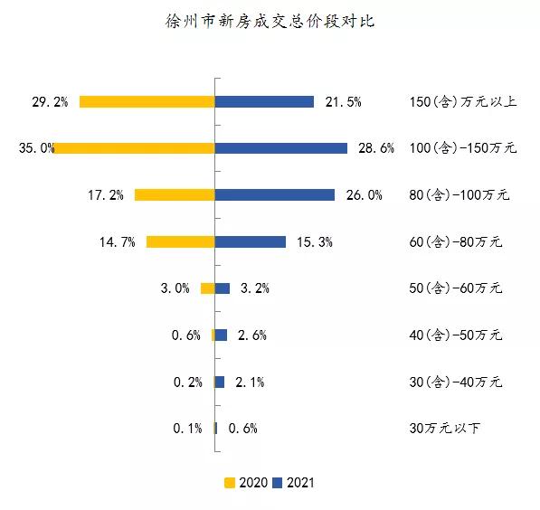 徐州100(含)-150万元总价段成交套数最多,达33641套,占比为28.6%,