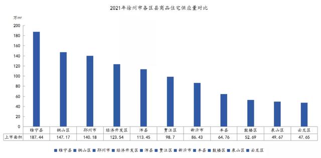 。2021年,徐州市商品住宅新增供应主要集中在睢宁县、铜山区、邳州市,供应面积分别为187.44万㎡、147.17万㎡、140.18万㎡。而市区主城区,鼓楼区供应面积为52.69㎡,泉山区49.67㎡,云龙区仅为47.65㎡。