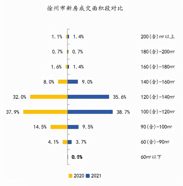 2021年,从面积段来看,徐州100(含)-120㎡面积段成交套数最多,达45566套,占比为38.7%,较上年扩大0.7个百分点。这说明徐州人越来越喜欢100-120㎡面积段的房子了。