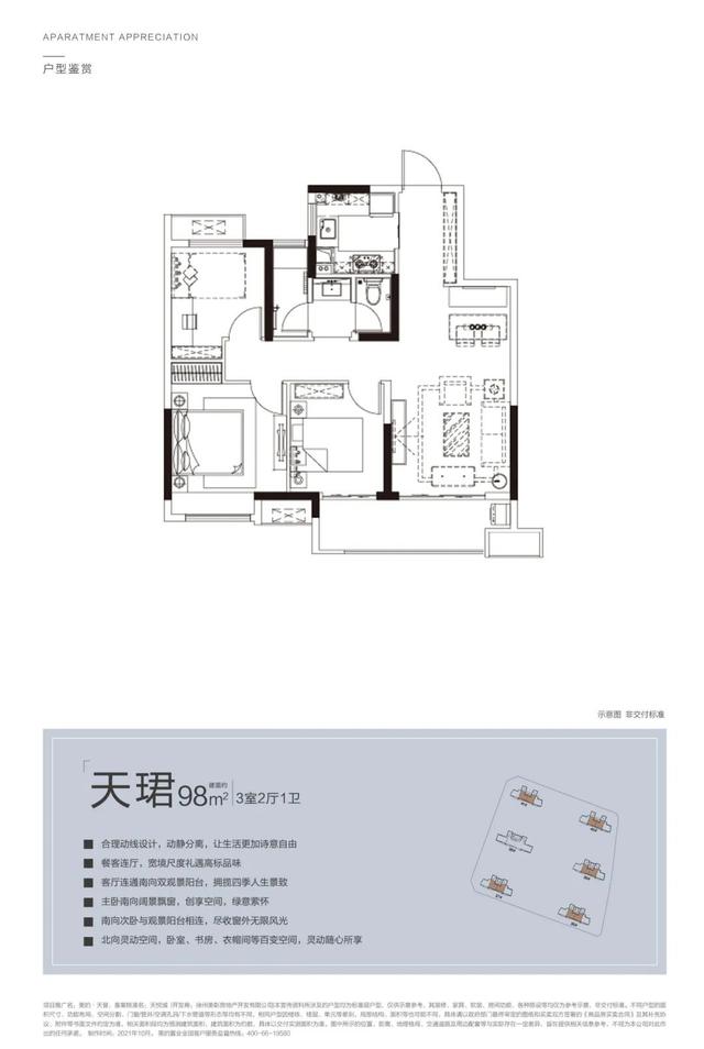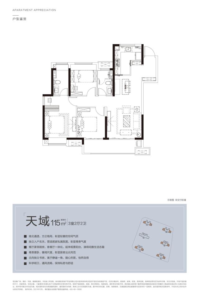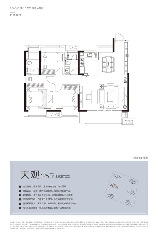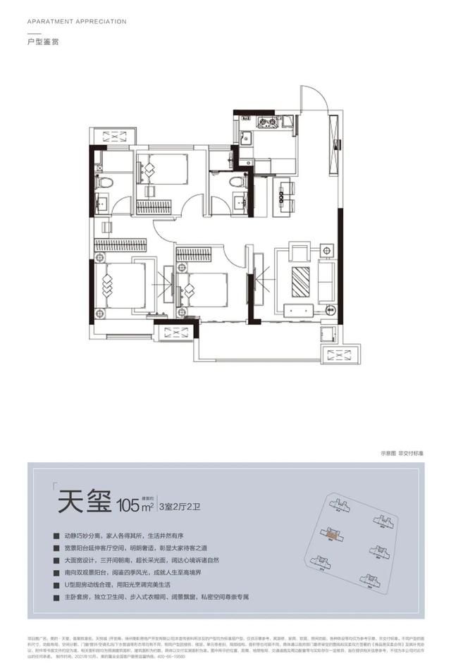 建面约105㎡三室两厅两卫户型,同面积段少见的双卫设计,可缓解早高峰的拥挤情况,如厕、洗漱、沐浴都会比较方便,更节省时间。而且在主卧划分独立卫生间,更符合现在都市的生活理念,便捷、私密、独立,不仅带来使用上的便捷与舒适,更是对品质生活的追求;餐客厨与阳台相连,“四位一体”开阔明朗,让家的尺度再一次被延伸,气度在此流转,营造非凡会客雅境。