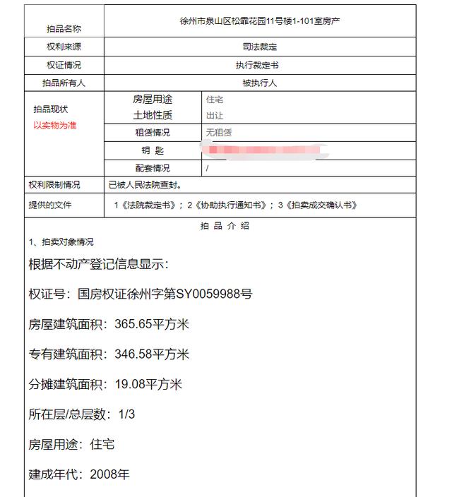 这是一套徐州市泉山区松霏花园11号楼1-101室的房产,房屋建筑面积:365.65平方米,专有建筑面积:346.58平方米,分摊建筑面积:19.08平方米,所在层/总层数:1/3,房屋用途:住宅,建成年代:2008年。