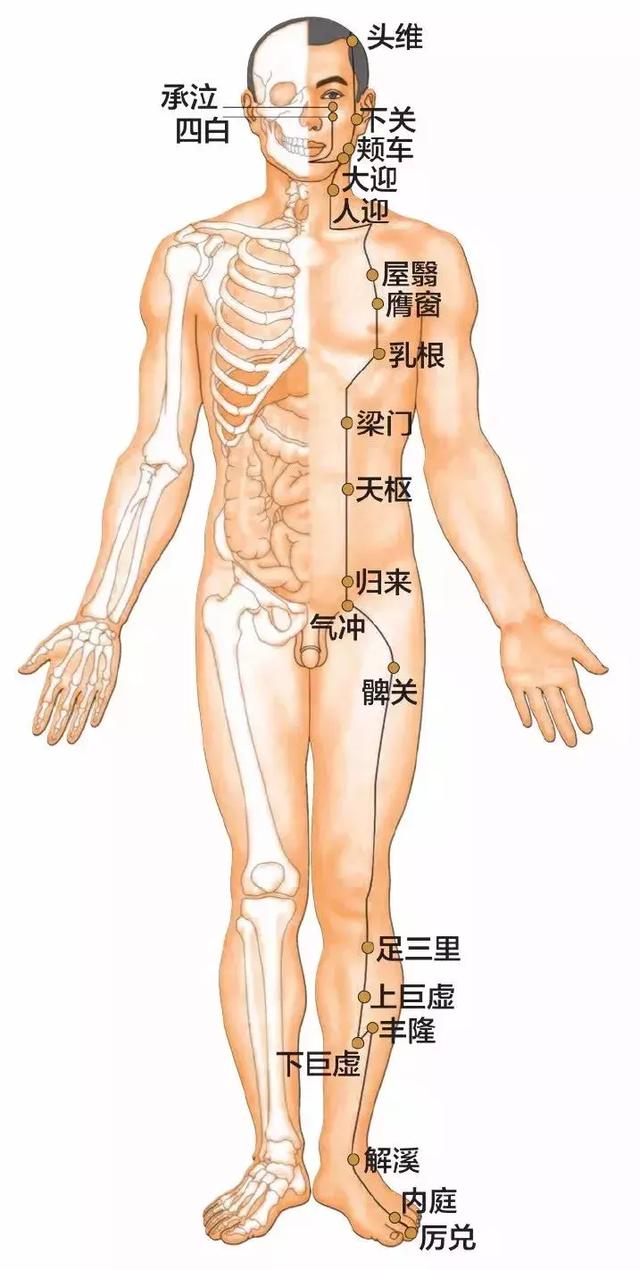 足阳明胃经分布于人体头面、胸腹、下肢外侧前缘及第2趾和大趾,循行45个穴位,首穴为承泣,末穴为厉兑。其中有11个穴位在头面颈部,19个穴位在胸腹部,其余15个穴位则分布在下肢前外侧和足部。