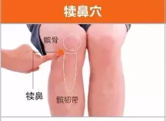 在膝部,屈膝时髌骨与髌韧带外侧凹陷中。