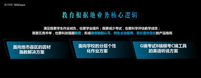在教育根据地,“双减”大背景下,科大讯飞通过因材施教、英语听说考试、个性化学习手册、讯飞学习机等业务产品,以刚需创造为核心,在国家重大政策及战略方向引领下,将“因材施教、五育并举”等理念推广全国,符合顺应时代要求。