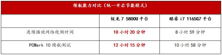 续航方面,我们统一在电源管理中开启了节能模式,然后进行实际的在线网络视频连续播放测试(屏幕亮度统一设置为70%,音量统一设置为60%)。此项测试中,锐龙7 5800U平台坚持了10小时20分钟,酷睿i7 1165G7则只坚持了8小时59分钟,锐龙平台有比较明显的优势。当然,连续播放视频相比日常应用来讲依然比较特殊,因此我们还使用了PCMark的现代办公续航测试,此项测试除了运行Office套件之外,还模拟了用户休息、笔记本待机的状态,因此更符合实际应用的情况。从测试结果来看,锐龙7 5800U平台的续航时间高达12小时15分钟,明显超过酷睿i7 1165G7平台的10小时58分,续航优势确实是很明显的,这与锐龙5000U采用创新的Zen3架构核心和7nm先进制造工艺不无关系。