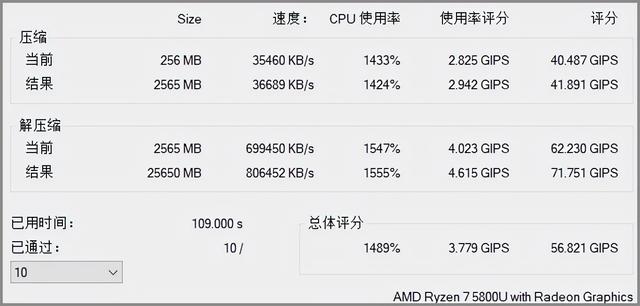 7-Zip测试中,核心/线程数更多的锐龙7 5800U优势明显,领先对手69%之多
