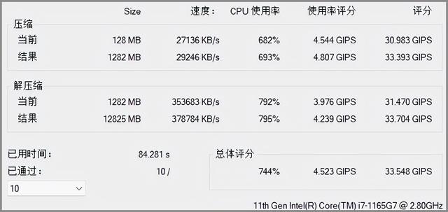 综合来看,在日常办公的应用中,两套平台体验比较接近,锐龙7 5800U要小胜一点,不过要是涉及到支持多线程处理的重度应用,例如常用的文件压缩/解压缩,锐龙7 5800U的优势就会充分体现出来,提供远高于酷睿i7 1165G7的执行效率。