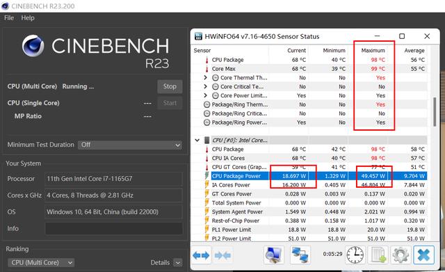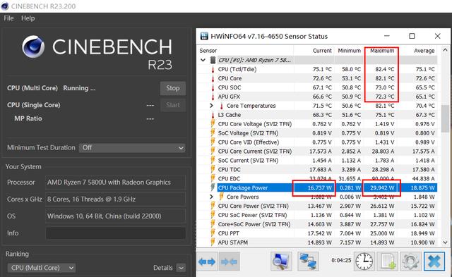 长时间渲染情况下,锐龙7 5800U温度和功耗表现更佳,酷睿i7 1165G7甚至撞到了温度墙
