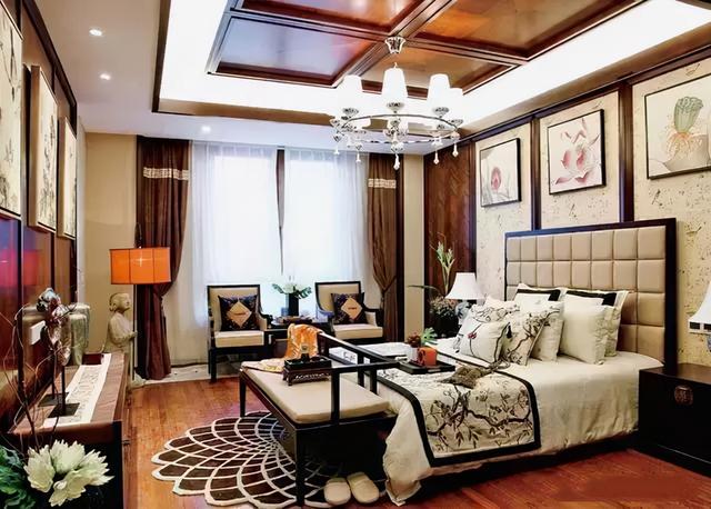 主卧空间的设计更具古典中式风格,加上红木线条和中国古画的点缀,整个主卧更加华丽。