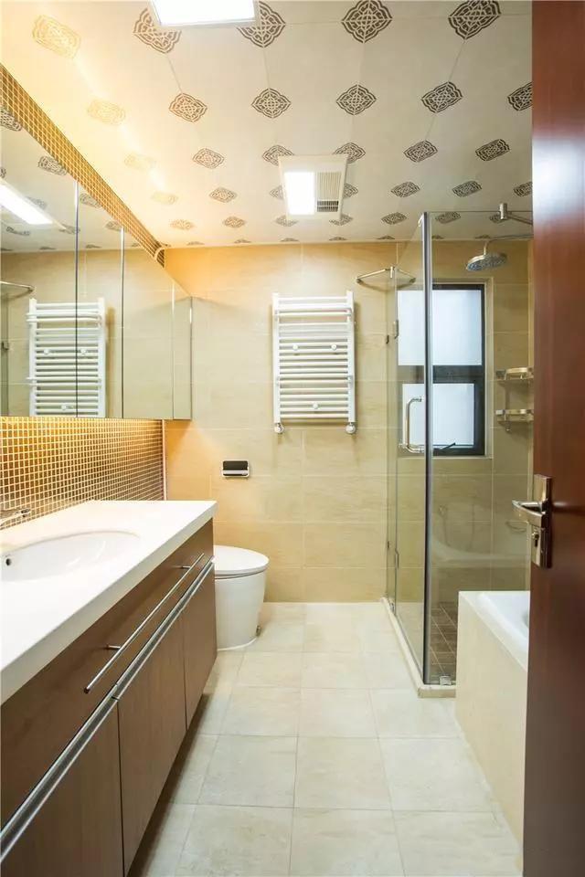 卫生间空间不多,但根据业主阿姨的需求,增加了一组浴缸,借助玻璃隔断进行干湿分离设计,加上马赛克瓷砖,让卫生间感觉豪华大气。
