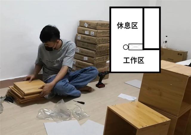 对于休息区和工作区的分隔,小弟打算用这个储物格进行简单划分,既有效区分了空间,又起到了储物的作用,一举两得。