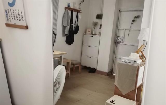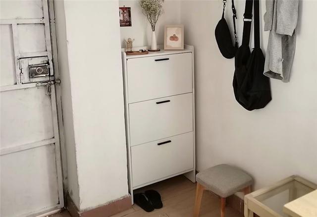 把它放在重新粉刷过的铁门上,虽然颜色不是很好,但也可以掩盖旧感,然后利用角落做一个换鞋柜,打造一个小玄关区。