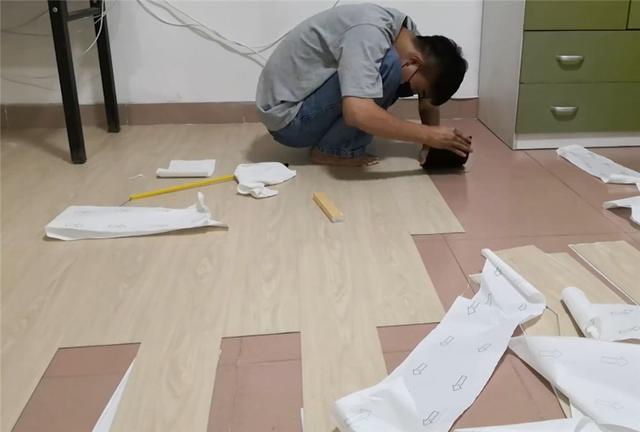 接下来,地板,破旧的瓷砖地板,看起来也很脏。小哥用简单的仿木贴纸,让地面又有了新鲜感。
