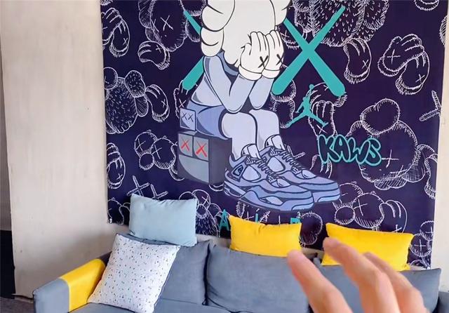 男主沙发也是便宜的布艺沙发,可以尽量买。因为头部总是会蹭墙,所以沙发背面贴了一个墙面覆盖物,相当于增加了靠背的空间。