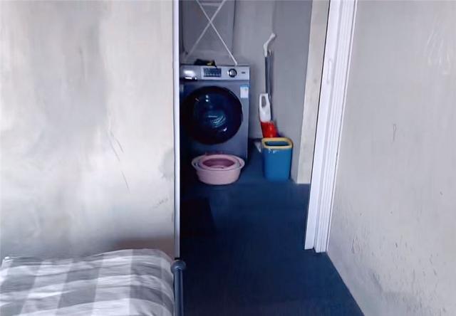 面向主卧的隔间是一个小洗衣房,里面有滚筒洗衣机、拖把、吸尘器等家里的清洁工具。