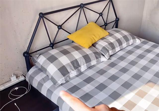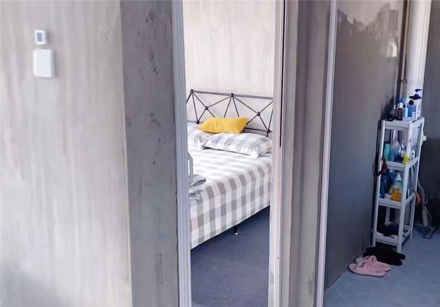 因为卧室安装了空调,原本打算用窗帘代替卧室门的两个人,最终决定不打孔安装简易折叠门。卧室床架,选择了黑色铁艺框架,但却符合这种水泥墙的“工业风格”装修设计,两者相辅相成。