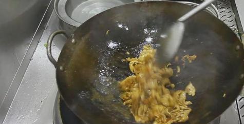 锅中烧电,把油烧至起烟,充足滑锅后倒进滚油,再添加冷油,热锅凉油,炒肉片的情况下,不易沾锅,把小肉倒进后,迅速把把小肉搅散,开低火,把小肉滑炒至掉色,煸炒90秒上下,随后倒出,控掉小肉上边的油。