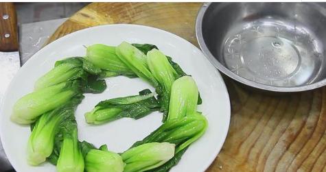 水烧开后,倒进菜心,绰水三十秒钟,捞起来后,沥干水分,随后摆放盘。