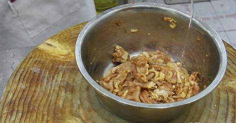 生猪肉一块,顶丝切一片,放进盆里,添加食用盐,白胡椒粉,米酒,酱油,迅速的搅拌均匀,运用机械设备摩擦渗入调料。