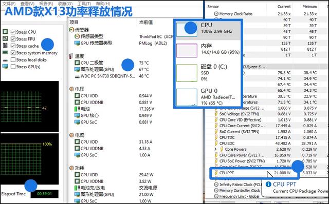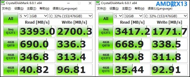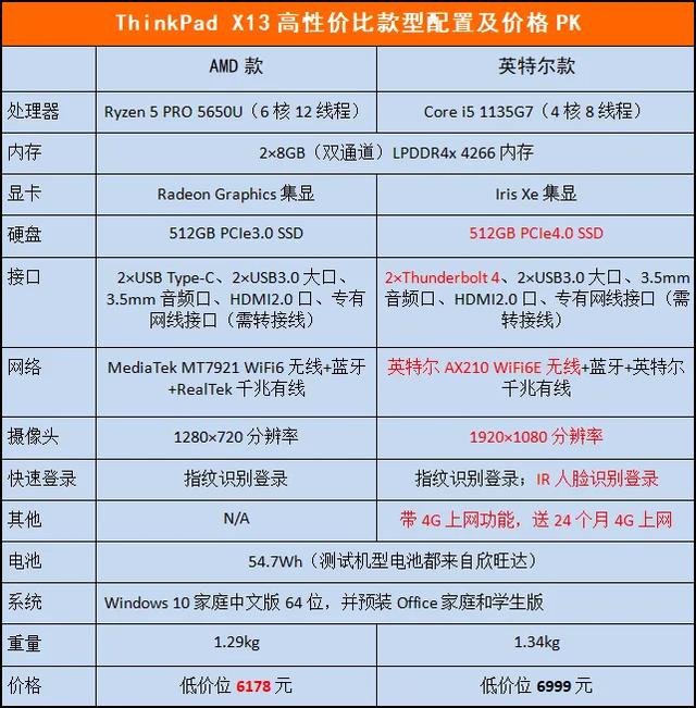 ThinkPad X13市面上新老平台都有,我们选择是两家的最新款型,AMD端是锐龙R5 PRO 5650U(有PRO标识为商用处理器,不过本文测试并不涉及相关内容。方便起见,下文中都去掉PRO字样),英特尔端是i51135G7。英特尔款略贵几百元,不过从配置和功能上明显更强——且不说处理器和显卡强弱,就是“看得见的明面儿上”,就有大量项目领先: ·SSD是PCIe4.0的,而AMD的锐龙5000U不支持PCIe4.0,只能搭载PCIe3.0规格的,速度方面,英特尔款明显更快。