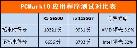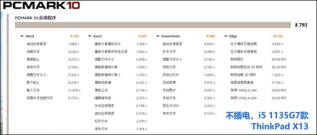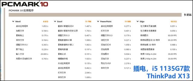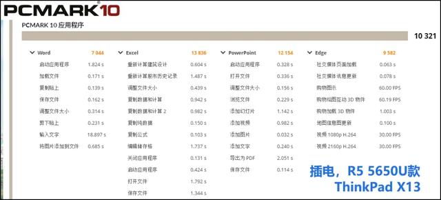 ▲插电测试,两款X13的PCMark10应用程序测试得分如上图(可点击放大看子项得分)。核心数量更多的R5 5650U款总分领先,10321 Vs 9931,领先幅度3.9%。子项成绩方面,Word、PPT都是微幅领先,Excel得分领先较多,不过在涉及多媒体素材的Edge网页部分,i5 1135G7款胜出。
