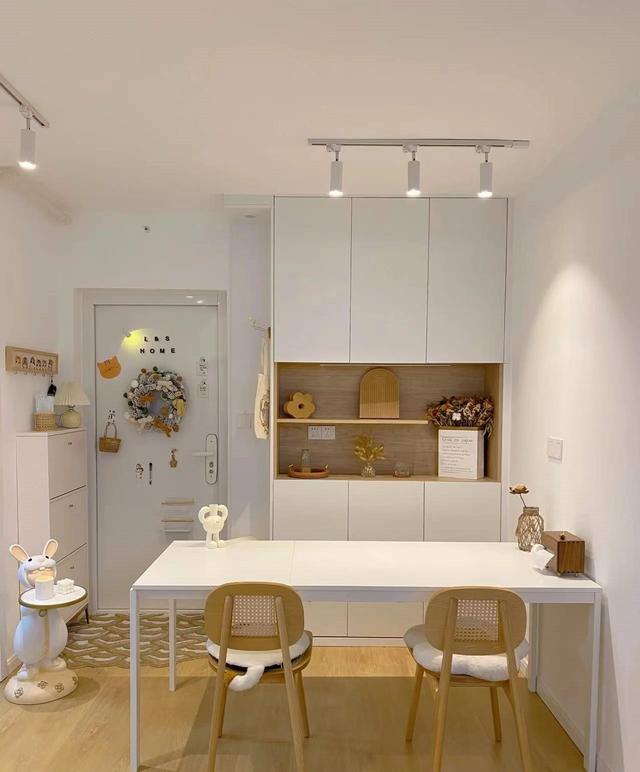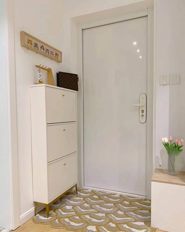 考虑到空间以白色为主,门也被刷成了白色,简洁干净,更适合内饰风格。门的右手边放置了一个低矮的鞋柜,轻巧轻便,基本可以满足一些日常鞋子的收纳需求。柜台上还有一个钥匙扣,方便挂钥匙,出门不易忘记。墙上的挂钩很有趣,可以用来挂衣服和装饰画,起到了很好的装饰效果。