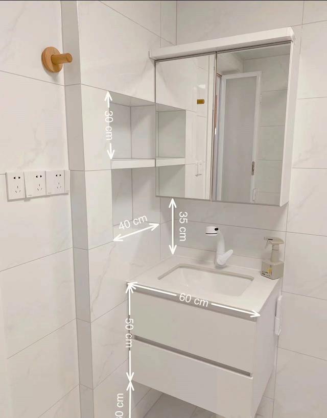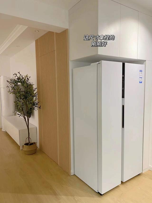 主人左转,利用墙面空间做了一个柜子,设计了压门,非常整洁大方,可以放一些家具和杂物。除此之外,房间是提前预定的,冰箱嵌入其中,与橱柜融为一体。一点也不空洞,整体感特别强。图中还标注了尺寸供大家参考。