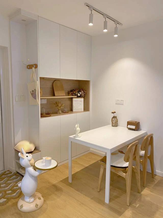 在门的左手边,还做了一个壁柜,是餐边柜和鞋柜。柜体采用分层设计,可收纳,可展示。侧面也有一排空出的空间来代替换鞋和凳子的功能。整个柜子特别轻,看起来不压抑。白色柜体搭配原木柜体,特别简洁自然。折叠餐桌特别适合这种小公寓。展开后可容纳多人食用。人少的时候可以收起来。不占地方,方便实用。具体尺寸也标注在图纸上,供您参考。