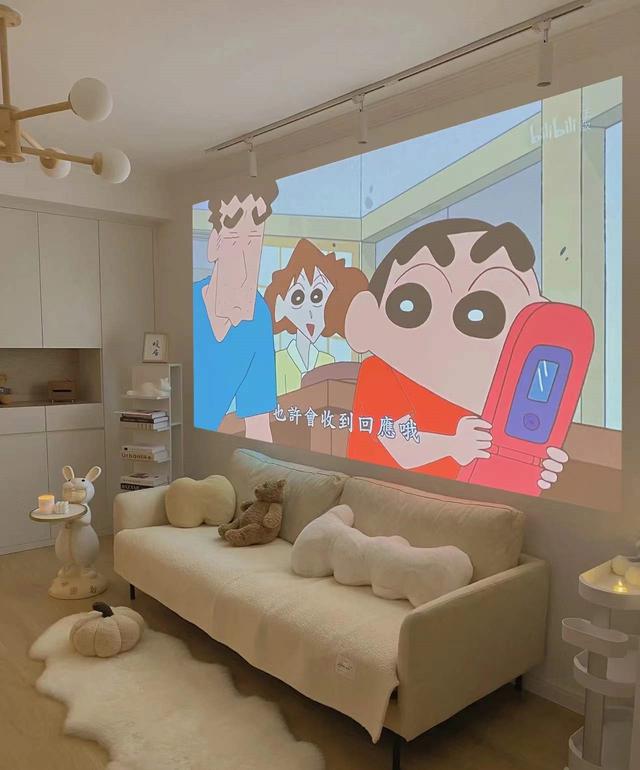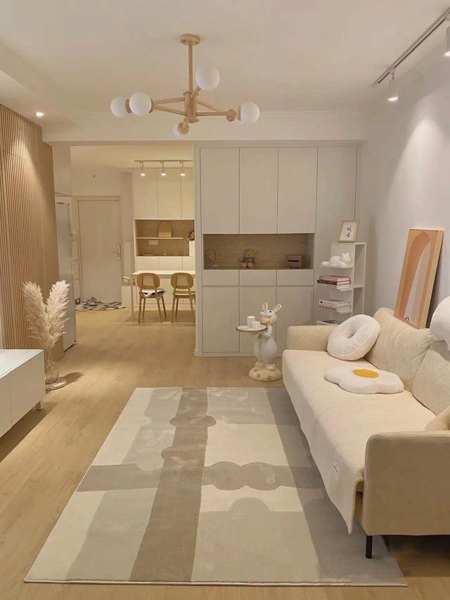 餐厅里面是客厅。这里做了一个壁柜来划分两个功能区,同时增加了家里的收纳。沙发背景墙刷白色乳胶漆,没有任何装饰。它被用作投影背景墙。视觉感知非常好。通常,我不想看电视。我只是坐在地毯上,看着屏幕电源。只是不要太享受。米色沙发搭配毛绒地毯和南瓜枕头,非常温柔有趣。沙发两侧有搁板和侧边件。