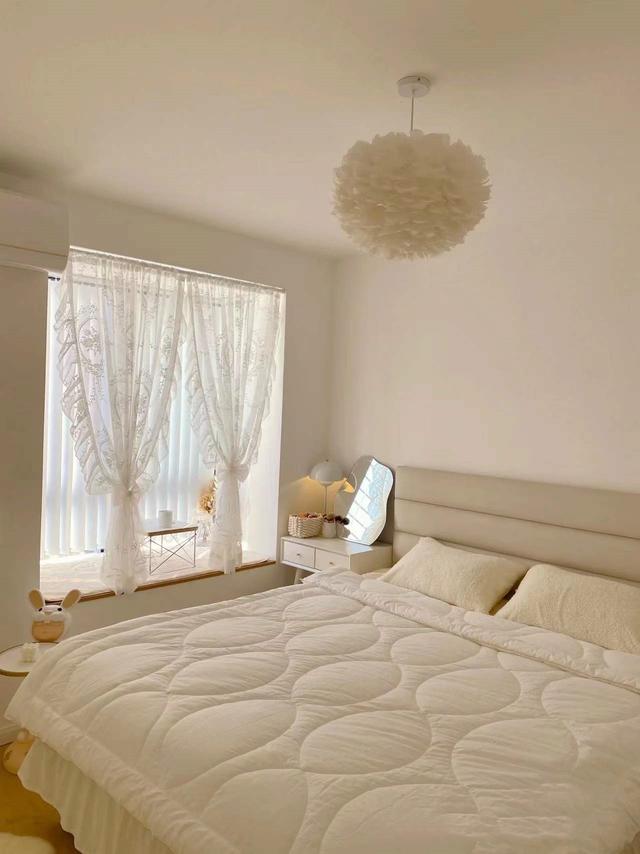 主卧布局很简单,没有吊顶,没有石膏线条,全部刷了大白墙,宽敞通透,简约干净,很耐看。搭配粉色床品、羽毛灯和蕾丝窗帘,为睡眠环境增添了几分温馨与浪漫。凸窗做成休闲区,方便平时坐在上面看书晒太阳。衣柜是定制的,有白色和金色的把手,简单精致。