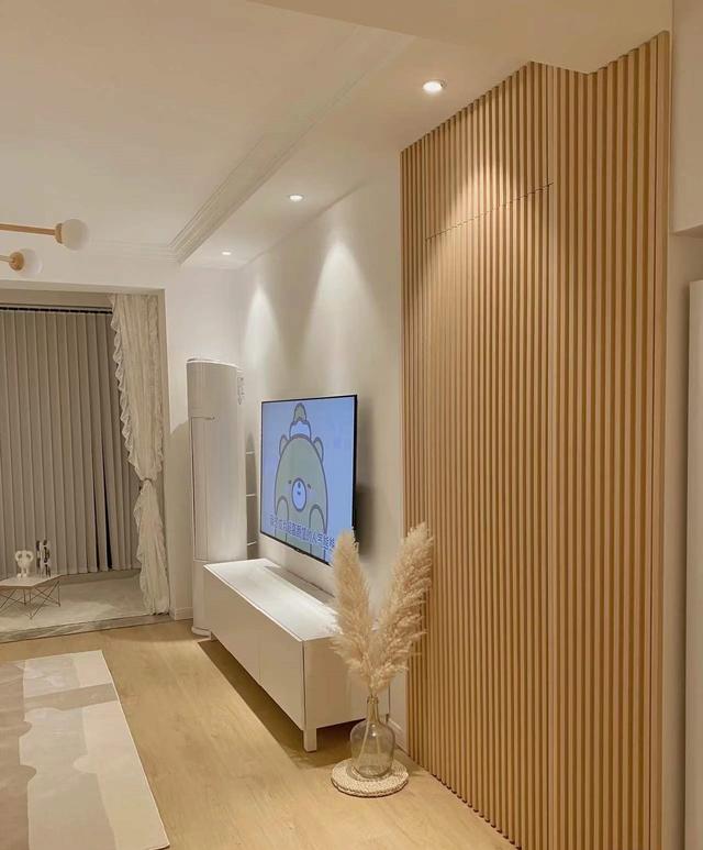 而且,即使将来需要装修,也会更容易,装修成本也会降低很多。木格栅设计在侧面,但我以为是电视背景墙。它其实是一扇进入卧室的隐形门,带有一点禅意,充满了东方文化的优雅气息,同时达到了背景墙的装饰效果,非常漂亮。这个设计真的让人眼前一亮。