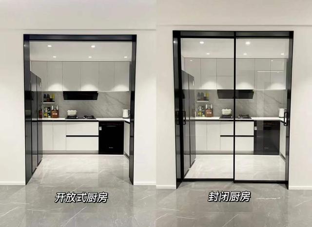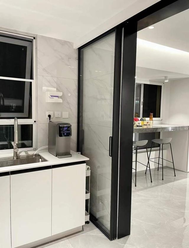 厨房做了一个推拉门,但设计是双隐藏式吊柜。当门打开时,它藏在右边的墙后面,瞬间变成一个开放式厨房。关门时是半开放式厨房,实现自由切换。墙壁和橱柜之间有一个缝隙,可以容纳推拉门。干脆留大一点,放一个30cm宽的储物推车,很实用!