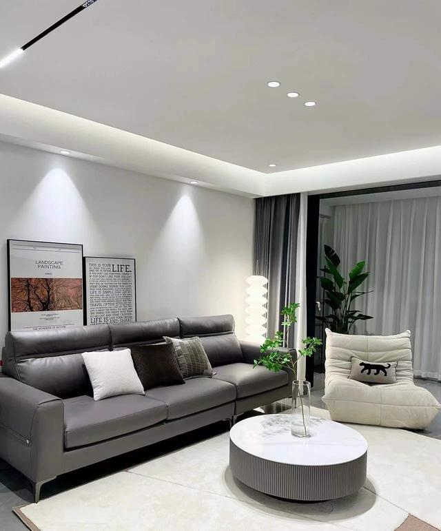 客厅采用大平顶吊顶设计,内嵌9w柔光带,并配有磁轨灯、筒灯、射灯,无主灯设计。很高级,不压层高,但有抬高层高的效果。白天餐厅通畅,采光较好,夜间光线更有层次感,大气。