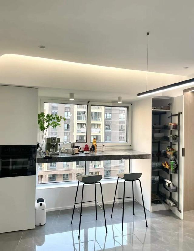 窗户设计有吧台和餐边柜的多功能空间。左边的柜子嵌有蒸烤机,右边的柜子作为小吃柜,装了一筐大怪物。左边可以烤甜点,右边可以拿零食,台面可以做咖啡,非常实用!