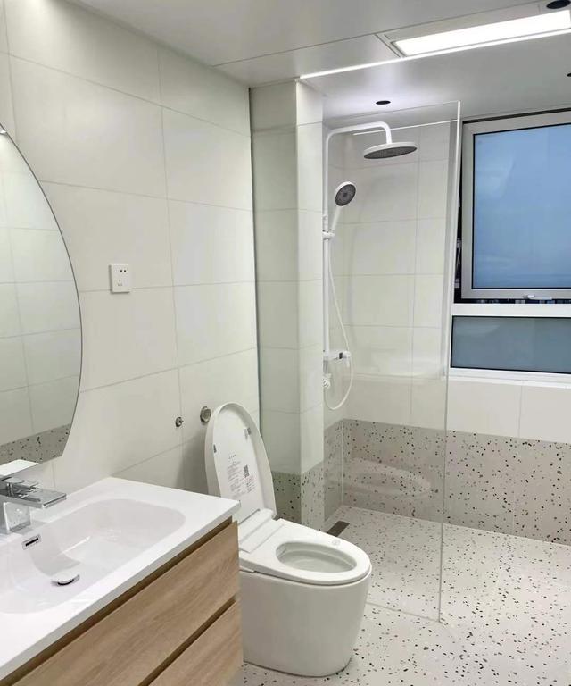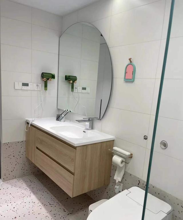 卫生间已经干湿分离,整体配色方便。为了明亮,白砖选用了网上名人水磨石。为了削弱这种密集的颗粒,使整体浴室温暖,选择了原木色的浴室柜。110cm的异形智能镜很有设计感,让空间格调瞬间上升。