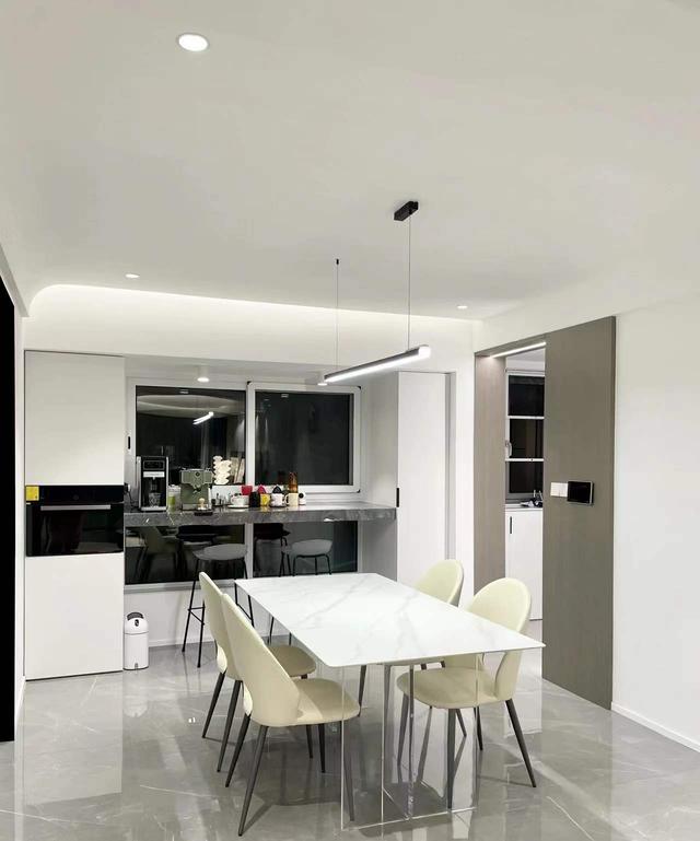 餐桌采用了悬浮式餐桌和亚克力桌腿,使桌板显得悬浮且可见,让空间会更加通透,充满高级感,具有非常科学时尚的氛围。