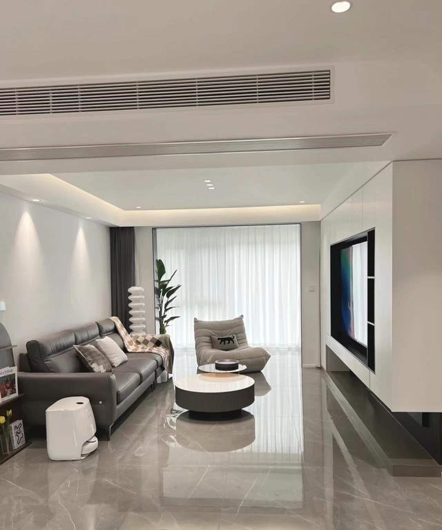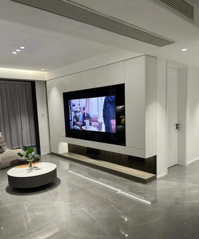 设计了整面墙的电视柜。整个柜子以白色为主,简单得就像没有把手的白墙。整体立面也比较干净,整体效果非常清爽。不仅大大增加了储物空间,还无形中提升了颜值和人品。嵌入85寸电视机,恰到好处,舒适。